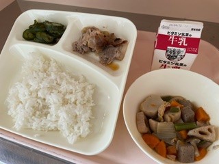 10月2日(水)、今日の給食は「豚肉のねぎじょうゆ焼き・ふきよせ煮・きゅうりの赤じそあえ・ごはん・牛乳」です。