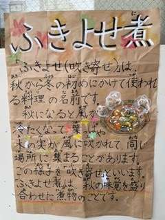 「ふきよせ煮」は風に吹き寄せられた落ち葉を思わせるように、秋の味覚を盛り合わせた料理をいいます。くり、ぎんなん、しめじ、まつたけ、もみじや松葉をかたどった生麩や野菜などが使われます。今日のふきよせ煮では、さといも、れんこん、しめじなどが使われています。