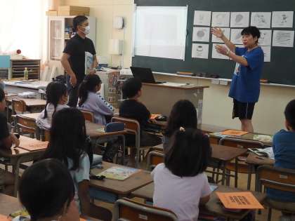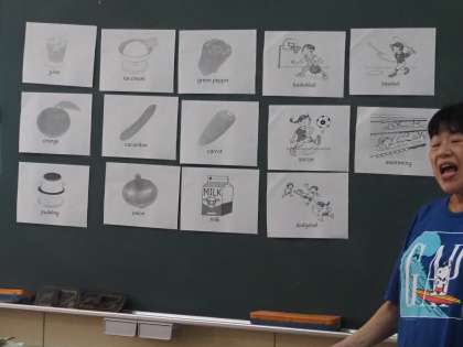 juice、ice cream、pudding、onion、milkus等の絵カードを黒板で示し、