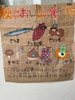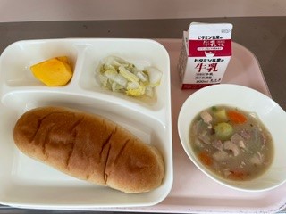 10月16日(水)、今日の給食は「鶏肉とさつまいものシチュー・はくさいのピクルス・かき(平核無柿)・黒糖パン・牛乳」です。
