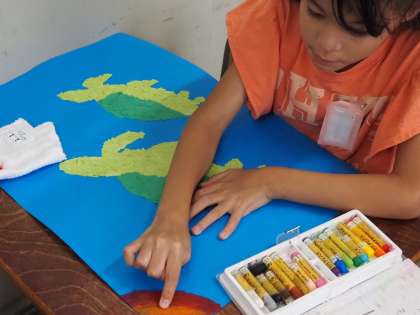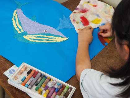 色画用紙、パスを使って、ちぎり絵作品を制作しました。子どもたち一人一人のアイデアや夢いっぱいの作品ができています。