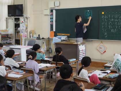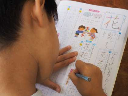 「花」という漢字について、筆順や「とめ・はね・はらい」をていねいに学んでいました。最後には、自分で書きました。