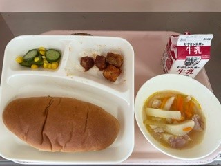 10月23日(水)今日の給食は「まぐろのオーロラ煮・スープ・きゅうりとコーンのサラダ・黒糖パン・牛乳」です。