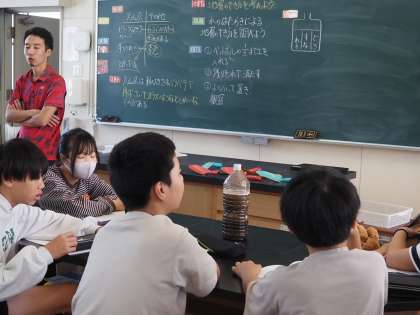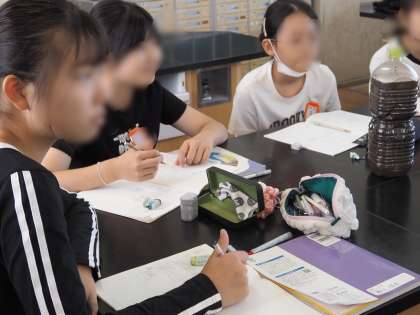 今日は、水のはたらきによる地層のでき方についての実験をしました。ペットボトルに土と水を入れ、しばらく静かに置いておいたときのたい積の様子について調べました。