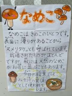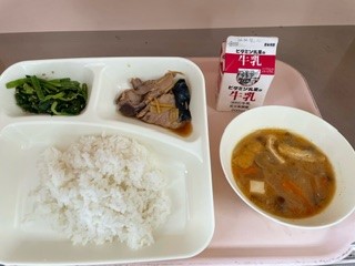 11月1日(金)、今日の給食は「なまりぶしのしょうが煮・なめこのみそ汁・ほうれんそうのごまあえ・ごはん・牛乳」です。