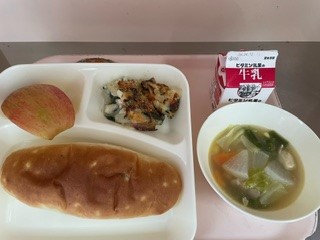 11月7日(木)、今日の給食は「ほうれんそうのグラタン・スープ煮・りんご・おさつパン・牛乳」です。