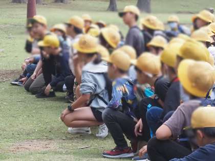 さあ、まずはグループ対抗のオリエンテーリングです。ルール説明を真剣に聞いています!