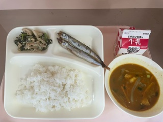 11月11日(月)、今日の給食は「焼きししゃも・さといもの和風カレー汁・ささみとこまつなのいためもの・ごはん・牛乳」です。