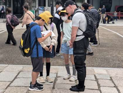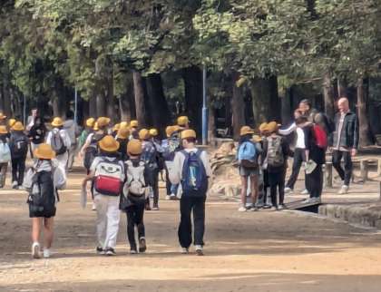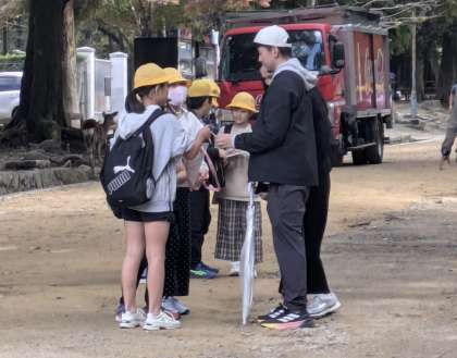 午前中のオリエンテーリングでは、奈良公園に観光に来られた外国からの観光客の方々に、インタビューしました。少し緊張したようです。