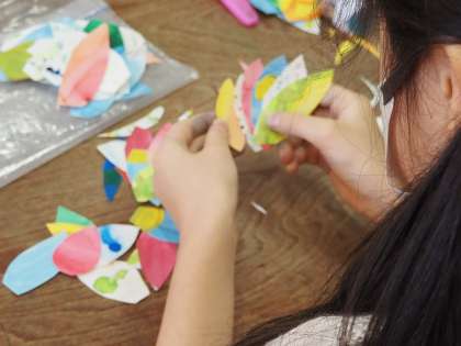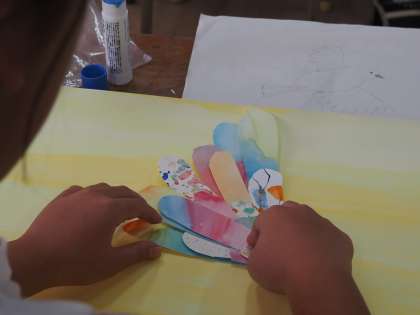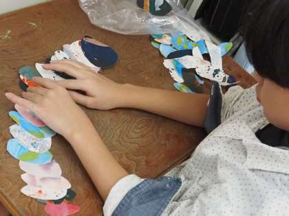 台紙に鳥の羽を置いて、完成させる鳥をイメージしながら、制作していました。