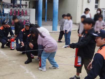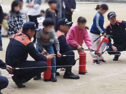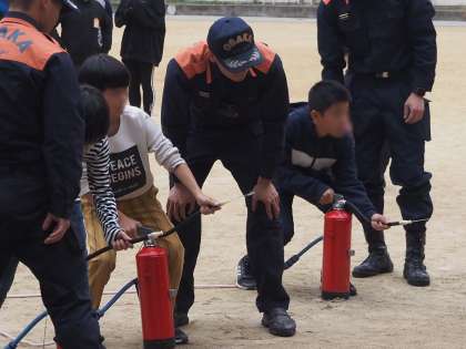消火器体験をしました。消火器を使う手順を教えていただきました。