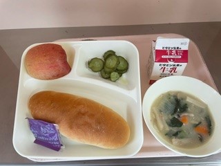 11月19日(火)、今日の給食は「鶏肉ときのこのクリームシチュー・きゅうりのピクルス・りんご・コッペパン・ブルーベリージャム・牛乳」です。