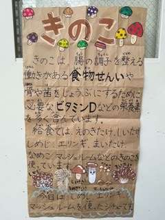 今日は、しめじ、エリンギ、マッシュルームなどのきのこを使った「鶏肉ときのこのクリームシチュー」でした。きのこは低カロリーで、食物せんいや、ビタミンB群、ビタミンDなどの栄養素が豊富です。きのこは苦手という児童が多いですが、ぜひ食べてほしい食品です。