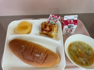 11月21日(木)、今日の給食は「ツナポテトオムレツ・スープ・白桃(カット缶)・黒糖パン・牛乳」です。