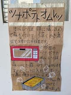 今日のツナポテトオムレツは、塩、こしょうで下味をつけた卵とツナ缶、じゃがいもをクラスごとに深型のバットに入れてオーブンで焼いています。個包装のケチャップをかけていただきました。