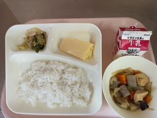 12月2日(月)、今日の給食は「卵どうふ・一口がんもと野菜の煮もの・キャベツとピーマンのそぼろいため・ごはん・牛乳」です。
