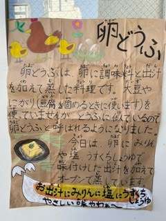 今日は手作りの「卵どうふ」です。クラスごとに深型のバットに入れて蒸しあげています。