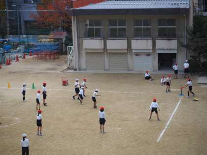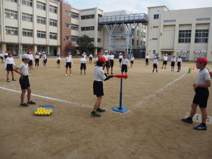 ティーにボールを置いて、バットで打ちます。なかなか打つのが難しいですが、子どもたちはしっかりとボールを見て運動を楽しんでいます。大縄跳びも学級の児童全員の連続跳びに挑戦しています。
