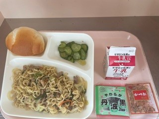 12月5日(木)、今日の給食は「和風焼きそば・きゅうりのしょうがづけ・ソフト黒豆・ミニコッペパン・牛乳」です。