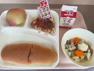 12月17日(火)、今日の給食は「とうふローフ・カリフラワーのスープ煮・りんご・黒糖パン・牛乳」です。