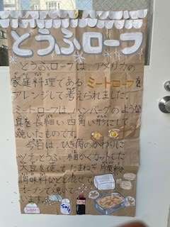 とうふローフは、アメリカの家庭料理である「ミートローフ」をアレンジしています。とうふのほかにツナ缶やカットされた大豆、たまねぎ、片栗粉、調味料などをよく混ぜて、1クラスごとに深型のバットに入れてオーブンで焼いています。ケチャップをかけていただきました。