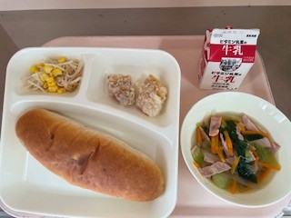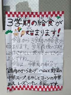 1月9日(木)、今日から3学期の給食がいよいよ始まりました。今日の給食は「鶏肉のからあげ・ハムと野菜の中華スープ・もやしとコーンの中華あえ・レーズンパン・牛乳」です。