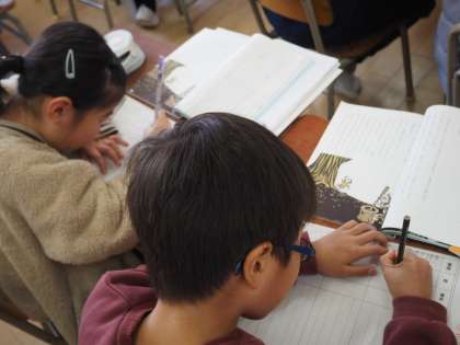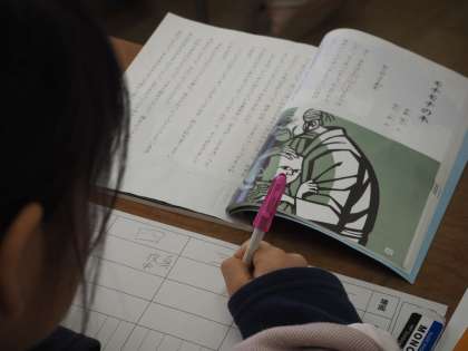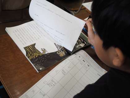 ワークシートを使い、人物や時や場所を手がかりに場面分けをしました。
