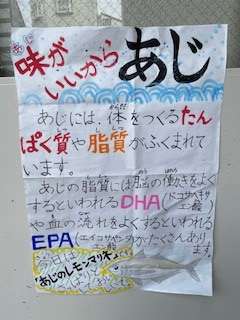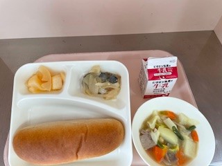 1月14日(火)、今日の給食は「あじのマリネ・てぼ豆のスープ煮・白桃(カット缶)・黒糖パン・牛乳」です。