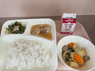 1月16日(木)、今日の給食は「鶏肉のおろしじょうゆかけ・一口がんもとじゃがいものみそ煮・みずなの煮びたし・ごはん・牛乳」です。
