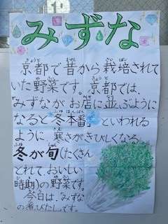 今日は、旬のみずなを使った「みずなの煮びたし」が登場しました。豚肉も使用し、うま味を増しています。