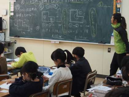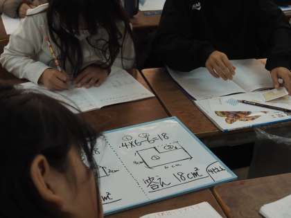 今日は、深い学びとして、長方形が重なった図形の面積をいろいろな方法で調べました。算数で大事なことは、早く正確に答えを導き出すことです。計算間違いをしないように気をつけて求めました。