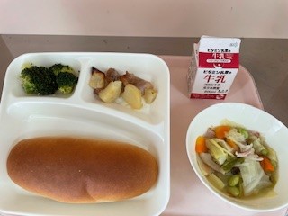 1月21日(火)、今日の給食は「鶏肉とじゃがいものガーリック焼き・スープ煮・ブロッコリーのサラダ・黒糖パン・牛乳」です。
