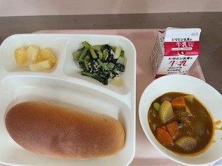 1月28日(火)、今日の給食は「ミートボールと野菜のカレー煮・ツナとこまつなのソテー・パインアップル(カット缶)・黒糖パン・牛乳」です。