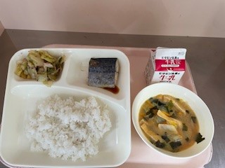 1月29日(水)、今日の給食は「さごしのしょうゆだれかけ・みそ汁・キャベツの赤じそあえ・ごはん・牛乳」です。