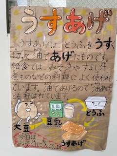 今日のみそ汁は、うすあげのほかにたまねぎ、はくさい、にんじん、わかめを具材にしています。今日は、寒かったので体が温まる一品でした。