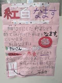 1月中は、いろいろなお正月のおせち料理が登場してきましたが、今日の「紅白なます」が締めです。にんじんはお正月の「金時にんじん」ではありませんが、白いだいこんに、にんじんのオレンジ色が映えていました。