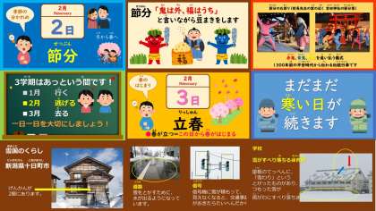 節分や暦の上では春が始まる立春の話を通して、日本の古くから伝わる生活の習慣や知恵、そして、雪国(新潟県十日町市)のくらしの工夫について紹介しました。