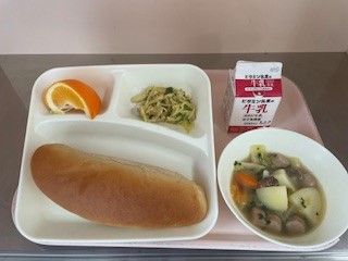 2月4日(火)、今日の給食は「ポトフ・カレーソテー・いよかん・黒糖パン・牛乳」です。