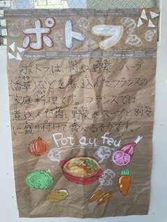 今日はフランスの家庭料理「ポトフ」でした。今日の給食では、牛肩ロースの角切り肉とウインナーソーセージ、じゃがいも、キャベツ、にんじん、、パセリを使っています。野菜がしっかりとれるスープです。