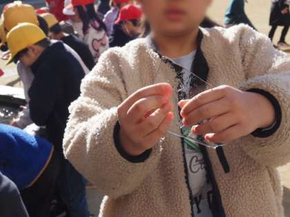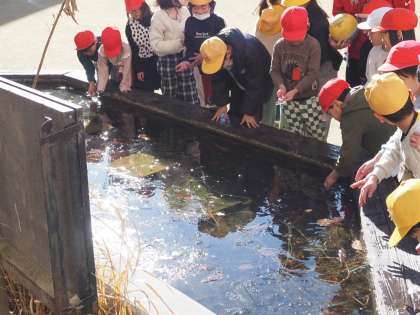 池の水には、氷がはりました。1年生から6年生まで、池の水が凍っているのを見ていました。