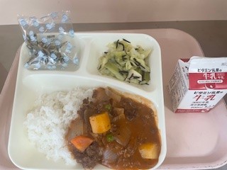 2月6日(木)、今日の給食は「ハヤシライス・キャベツのひじきドレッシング・ミニフィッシュ・牛乳」です。