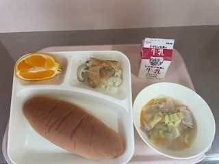 2月17日(月)、今日の給食は「押し麦のグラタン・スープ・デコポン・黒糖パン・牛乳」です。