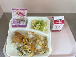 2月18日(火)、今日の給食は「カツ丼・キャベツの梅風味・いもけんぴフィッシュ・牛乳」です。