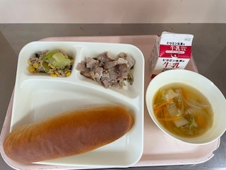 2月25日(火)、今日の給食は「豚肉のオイスターソース焼き・中華スープ・ツナとチンゲンサイのいためもの・黒糖パン・牛乳」です。
