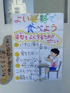 今日は「食事中の姿勢」についてふれました。よい姿勢で食べると、胃(腹部)の圧迫を防いで、食べ物の消化・吸収をよくします。また、見た目がよくなり、食事マナーを守って気持ちよく食事をすることができます。ご家庭でも、食事をするときの「姿勢」についてお子さんと話してみてください。