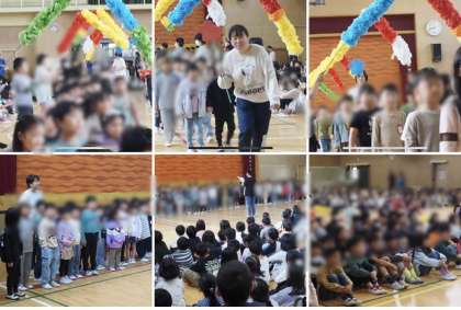 今日、新しく入学してきた1年生と2年生から6年生までの在校生が、初めて対面した「1年生を迎える会」が温かな雰囲気の中で開催されました。