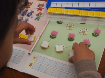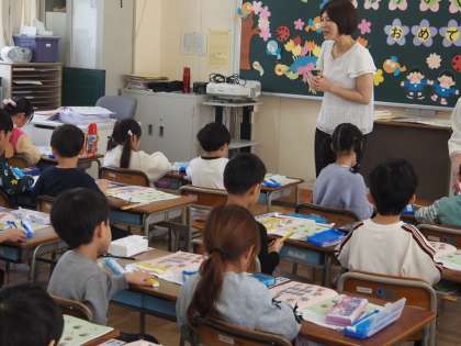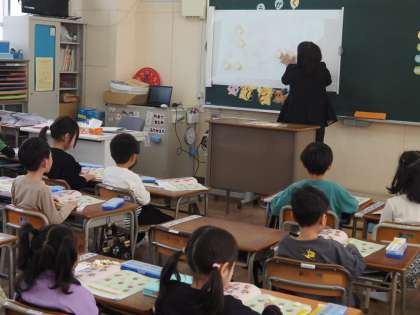1年生の算数では、おはじきを使って、数の学習をしました。(教科書4・5ページ)先生の話をしっかり聞いて、学習しています。