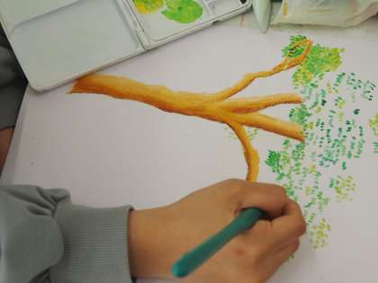6年は水彩画で木を描いています。パスを使っても構いません。葉の一枚一枚、枝の影の描き方を工夫しました。
