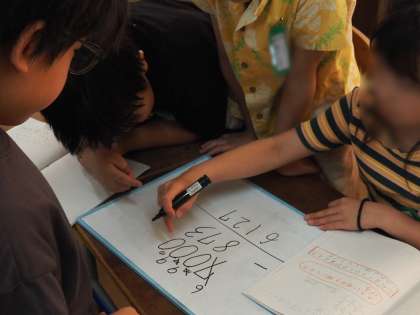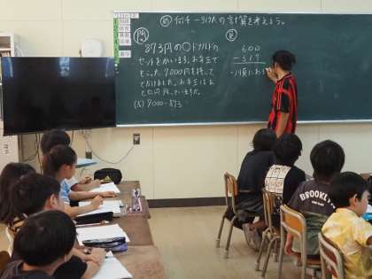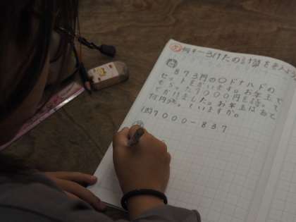 3年の算数は、(何千)−(3けた)の計算です。(何百)−(2けた)のひき算のときと同じように考えて答えを求めました。子どもたちは、学んだことを活用して計算しています。