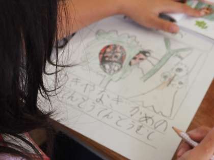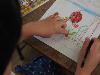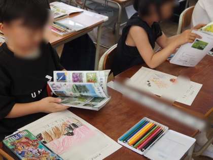 1年の生活科は、春から夏のいきものについて学習しています。今日は、図鑑を使って虫や花の絵を描きました。